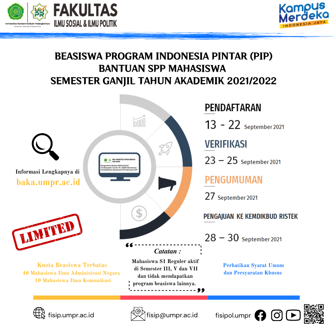 Kementrian Pendidikan, Kebudayaan, Riset dan Teknologi menyampaikan program lanjutan Beasiswa Program Indonesia Pintar (PIP) Bantuan SPP bagi mahasiswa yang terdampak Covid-19. Bantuan SPP ditujukan bagi mahasiswa aktif dan bukan penerima KIP Kuliah/Bidikmisi, serta kondisi keuangannya memerlukan bantuan SPP Semester Gasal Tahun Akademik 2021/2022. Perhatikan Syarat Umum dan Syarat Khusus. Segera Melakukan Pendaftaran. Kuota Terbatas. ...Read More